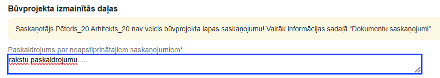 Zem brīdinājuma bloka lietotājs var pievienot skaidrojumu par neapstiprinātajiem saskaņojumiem, kas pēc iesnieguma iesniegšanas būs redzams arī BIS2 iesnieguma dokumentā.