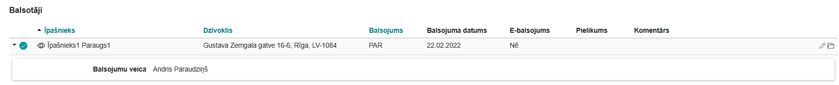 - Ja balsojums ir veikts par visiem izvēlētā dzīvokļa īpašniekiem, sistēma balsojumā norādīto informāciju dublē kā katra atsevišķā īpašnieka balsojumu.
